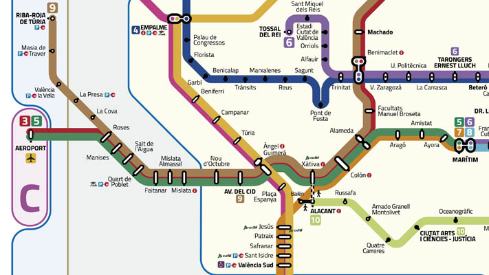 This is the main train station in Valencia, serving both commuter and some medium and long-distance trains. It connects to multiple destinations near and far from the city, such as Alicante. Located in the heart of the city, you can take other means of transportation, such as metro and bus, from here to reach your final destination.