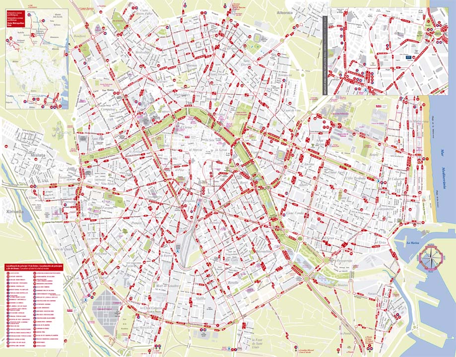 The urban bus map of Valencia, featuring the iconic red EMT buses, is quite extensive, as you can see. However, we offer a high-quality map for your reference if necessary.